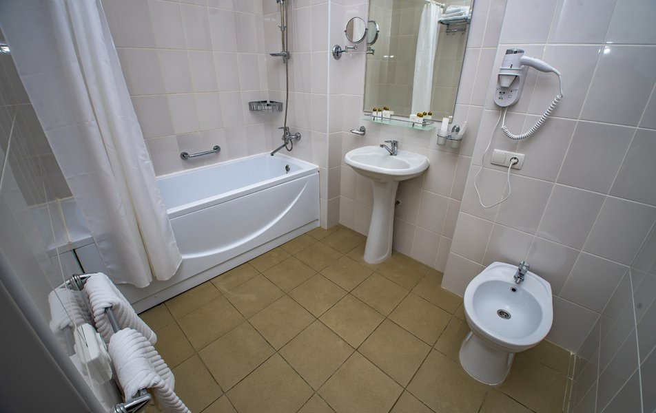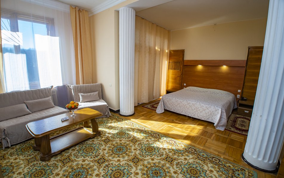 Большой номер для еще более комфортного отдыха. Одна просторная комната вмещает в себя одну большую кровать и диван. Много вещей точно поместится в номере: есть большой шкаф, тумбочка со множеством ящиков. Специально для женщин есть трюмо с зеркалом.